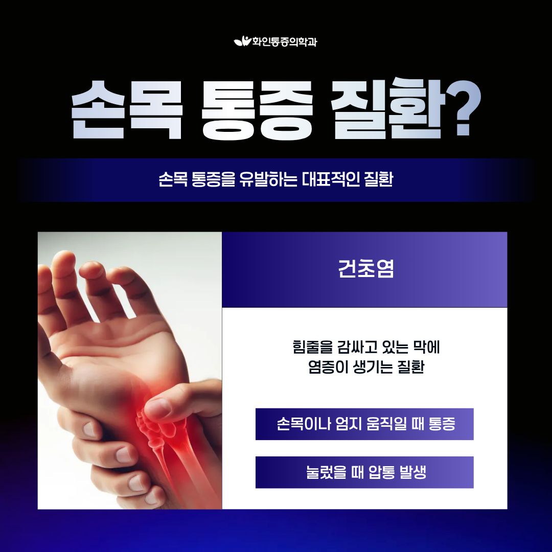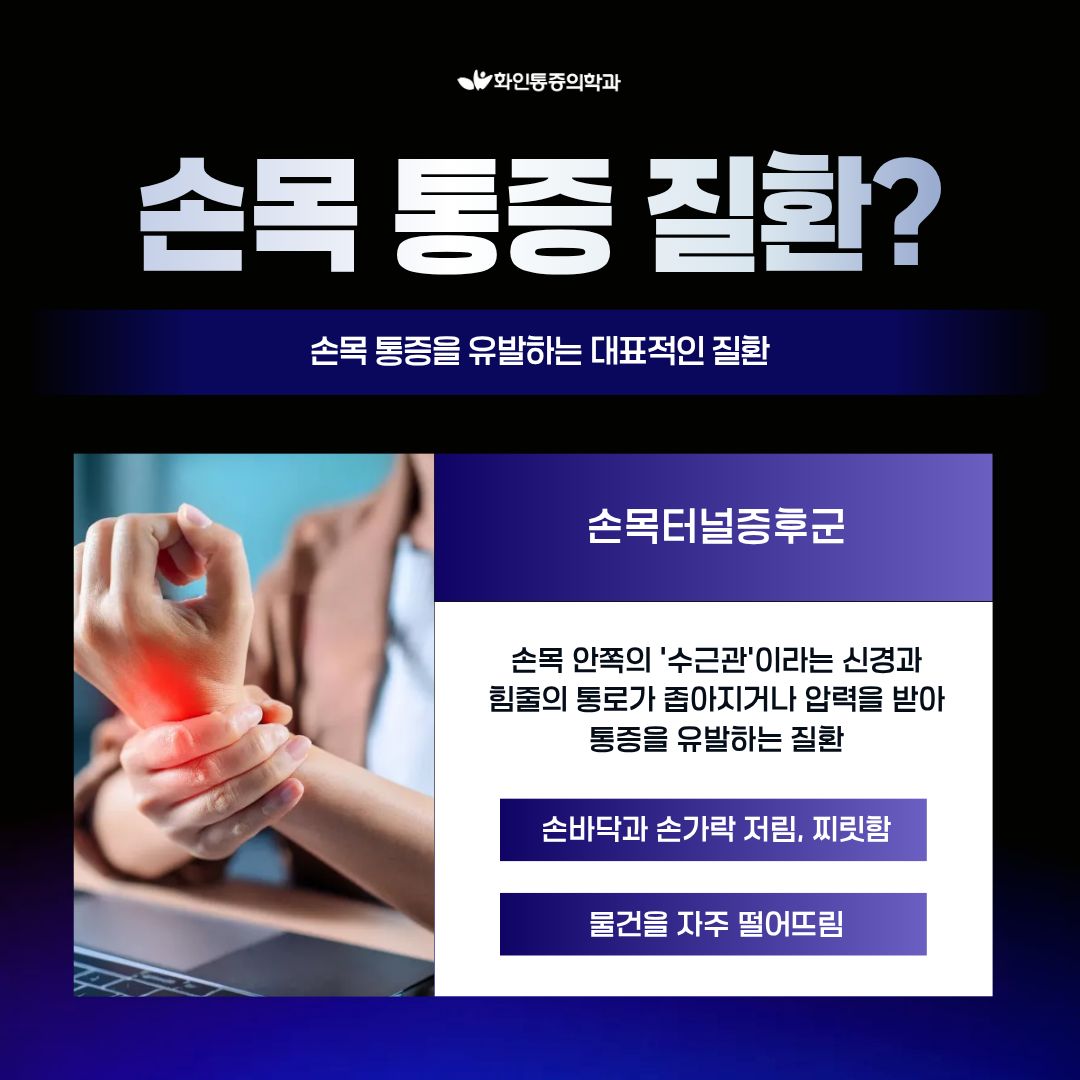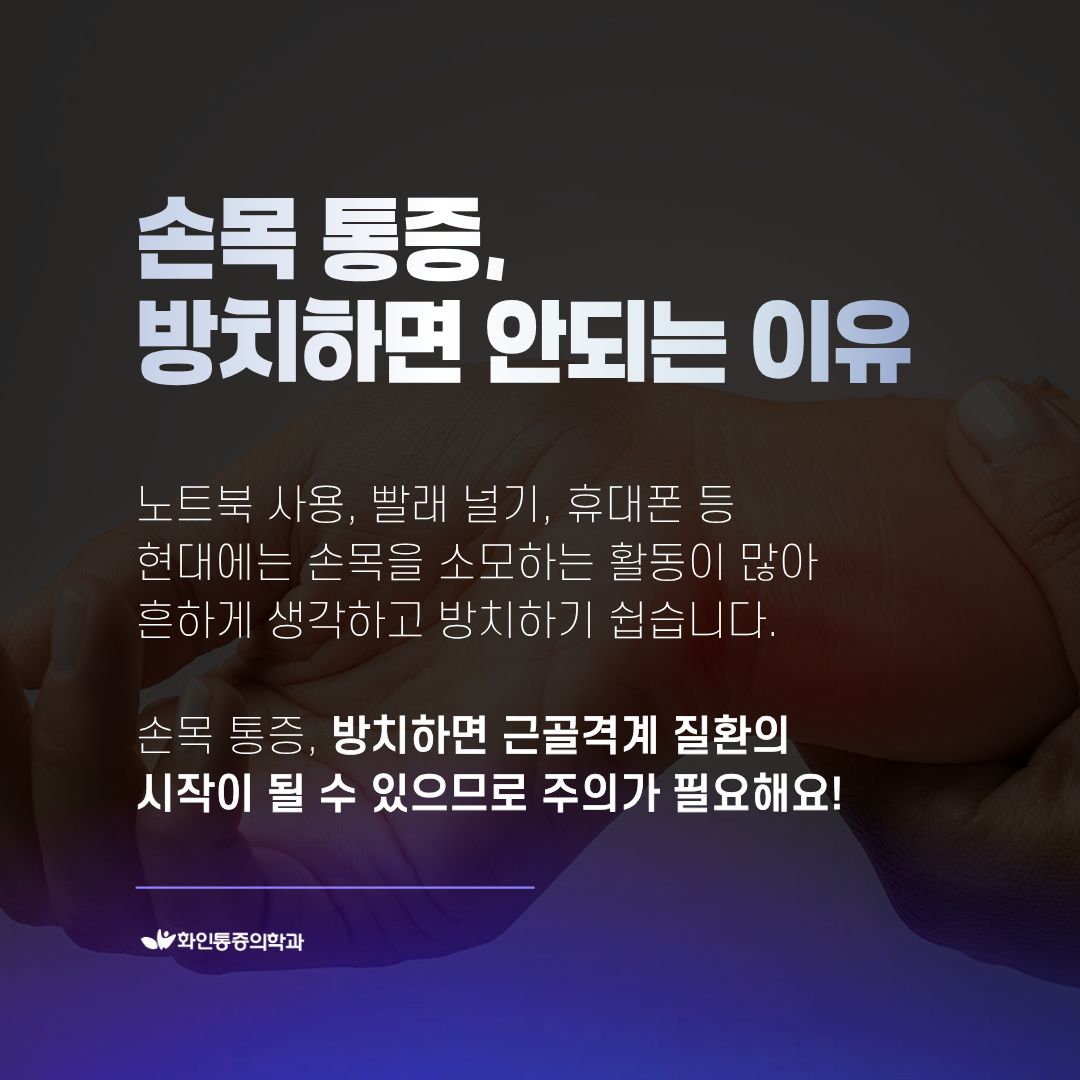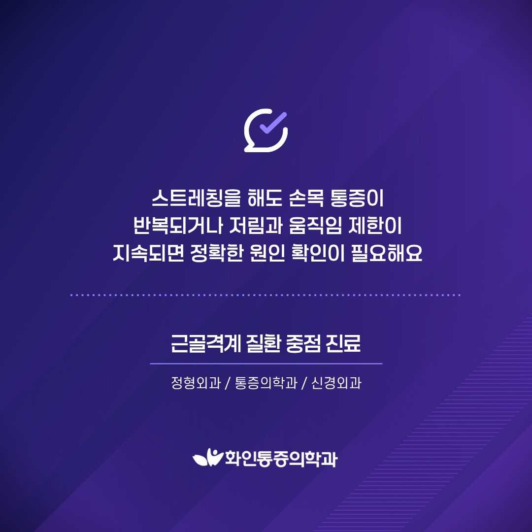 | 손목 통증, 반복된다면? 손목터널증후군 · 건초염 손목이 보내는 중요한 신호일 수 있습니다. |